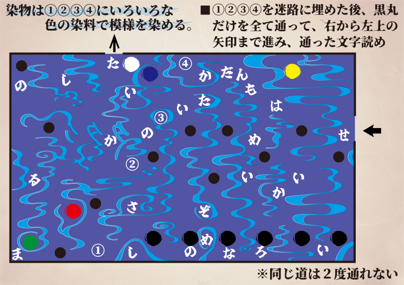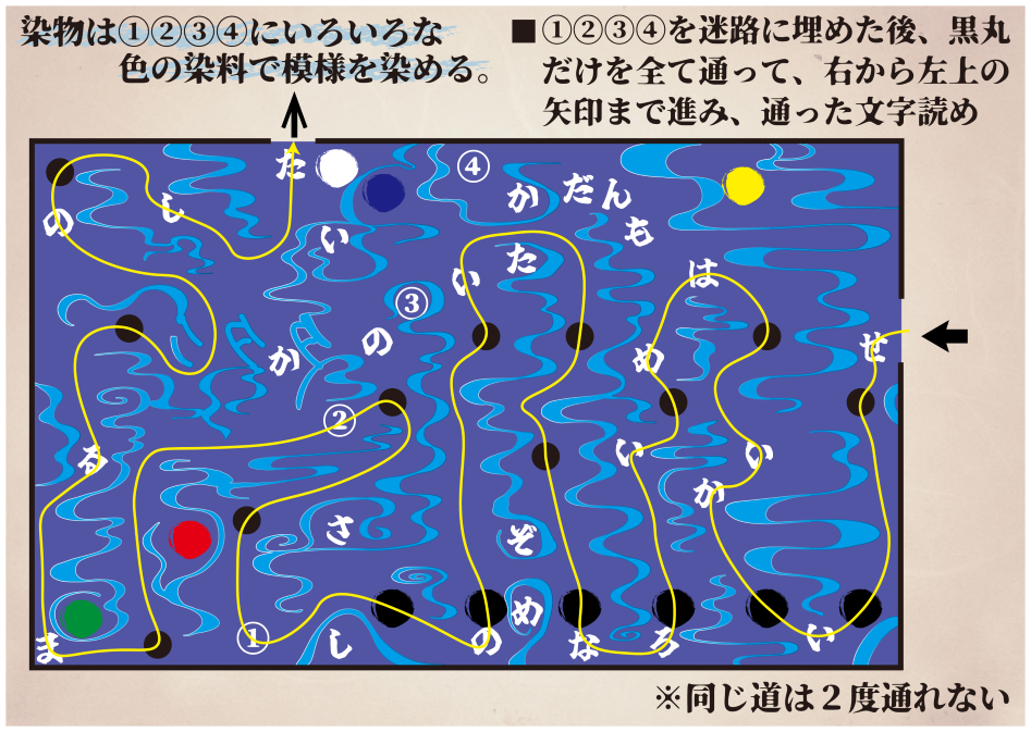 「わざを伝える」サイトの「人間国宝のわざ」ページから、染織の情報を見よう。 日本工芸会「わざを伝える」公式サイト 送信する 得るべき情報のヒント「染織のわざ」の最初の説明で、染物について書かれた内容を見よう。問題と見比べれば①②③④に入る言葉が分かるはずだ。 得るべき情報①②③④に入るのは、しろきじ(白生地)だ。 暗号のヒント黒丸は全て通るということを利用しよう。黒丸が分かれ道ではなく通路の真ん中にある場合は、必ずその道を通るはずだ。 暗号のヒント②途中まではこのような道を通る。最後まで正しく通ると新たな指示が現れる。丸数字に入る文字も忘れずに読もう。 迷路の答え以下が正しいルートである。現れる指示はせいかいはめいろないのしろまるのした(正解は迷路内の白丸の下)だ。 新たな指示が出た後のヒント迷路の中を探すと一つだけ白い丸があるはずだ。 暗号の答えゴールの右下に白丸が存在する。その真下を読んで、答えはいろさしだ。 問題選択ページに戻る